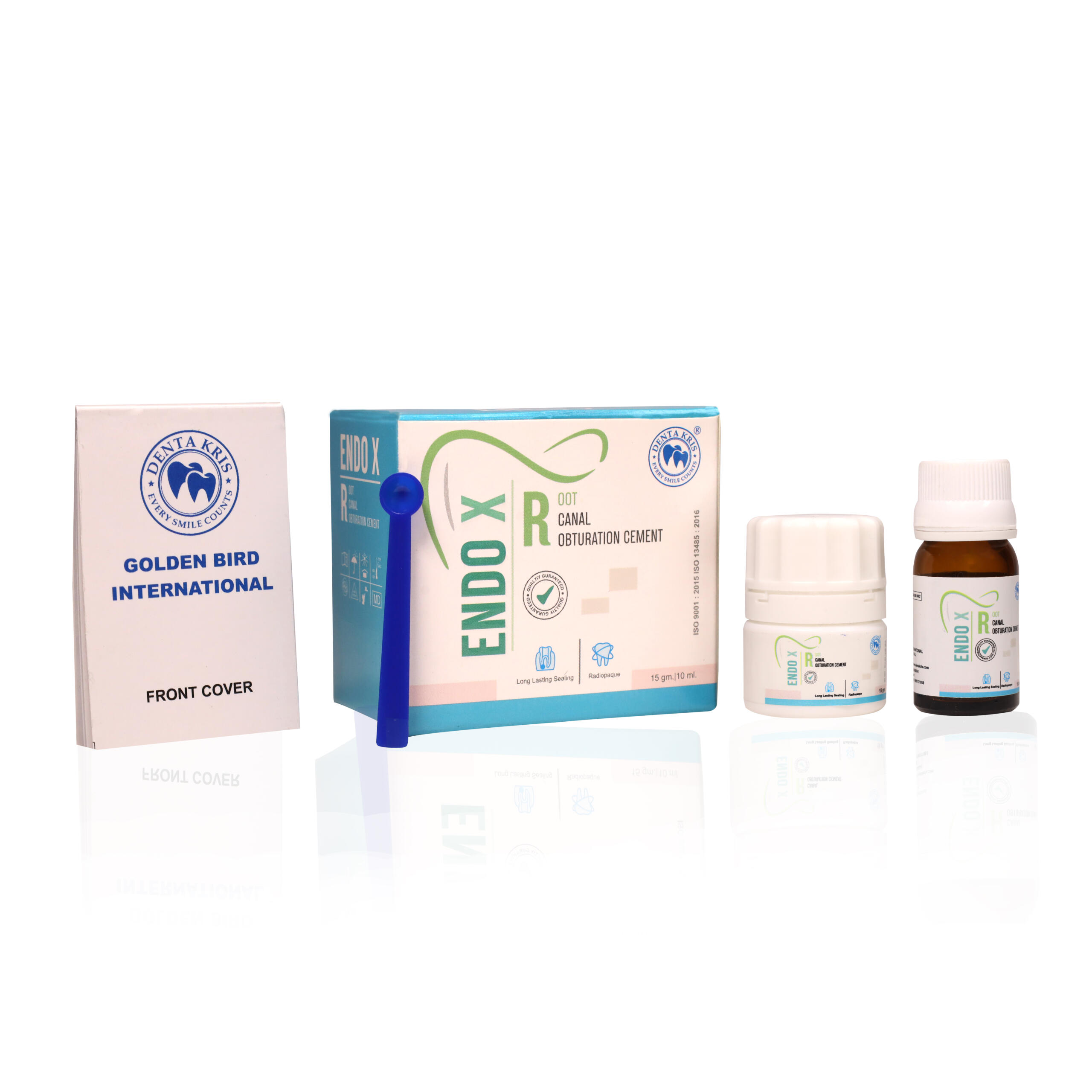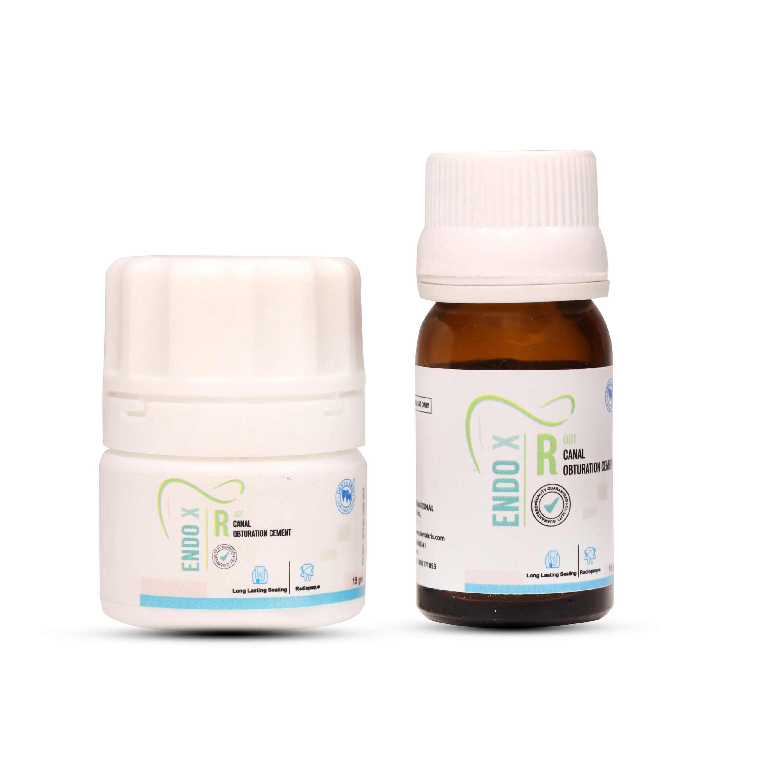 Description: Endo X is capable of sealing the canal laterally and apically, unaffected by tissue fluids and insoluble, bacteriostatic, provides antiseptic, anti-inflammatory and germicidal action, radiopaque, easily removed from the canal if necessary, do not stain in the tooth, biocompatible, dimensionally stable, use to prevent micro-organism which remain in the root canal after preparation from proliferating and passing periapical area, to seal the pulp chamber and root canal system f rom out oral environment, filling root canal with gp point.