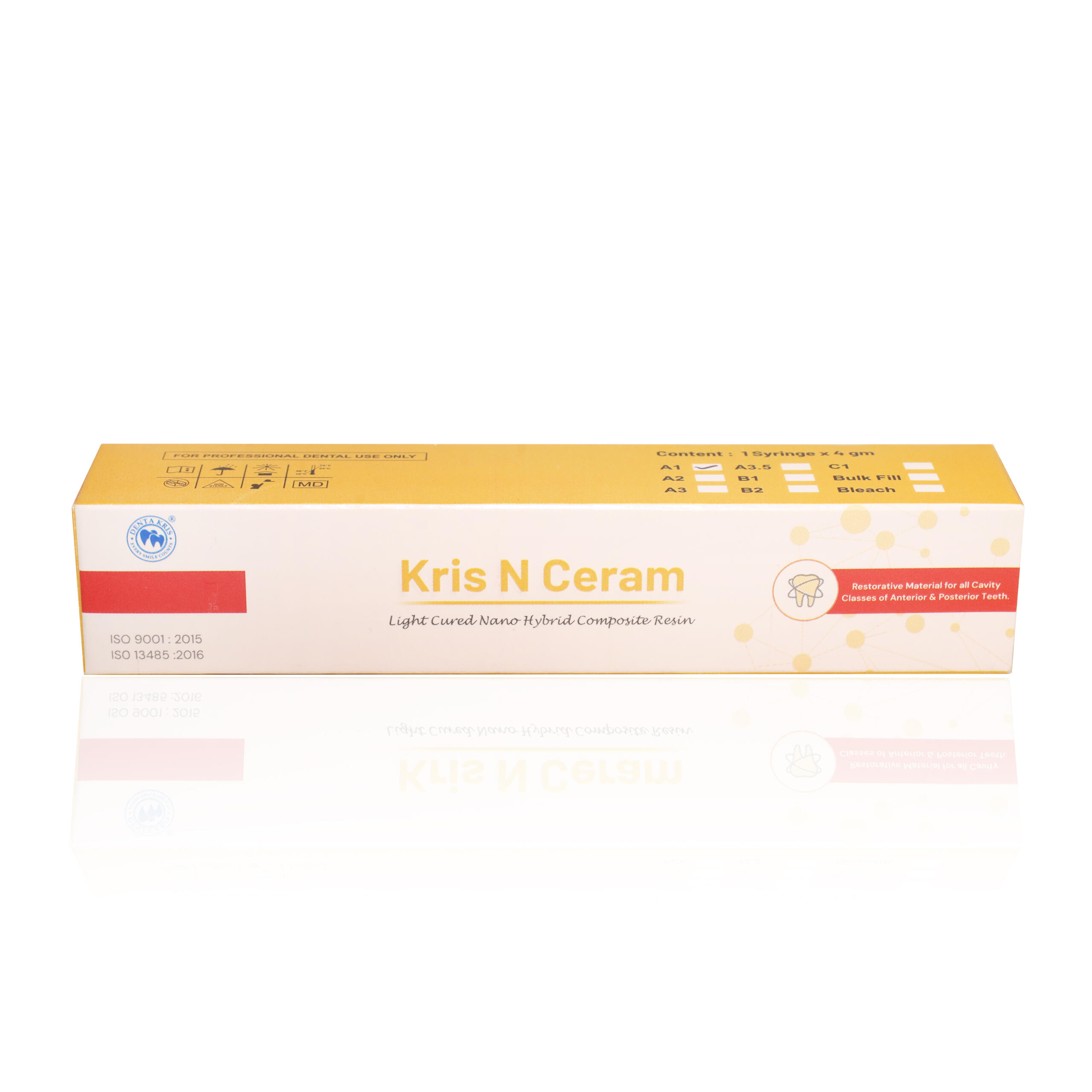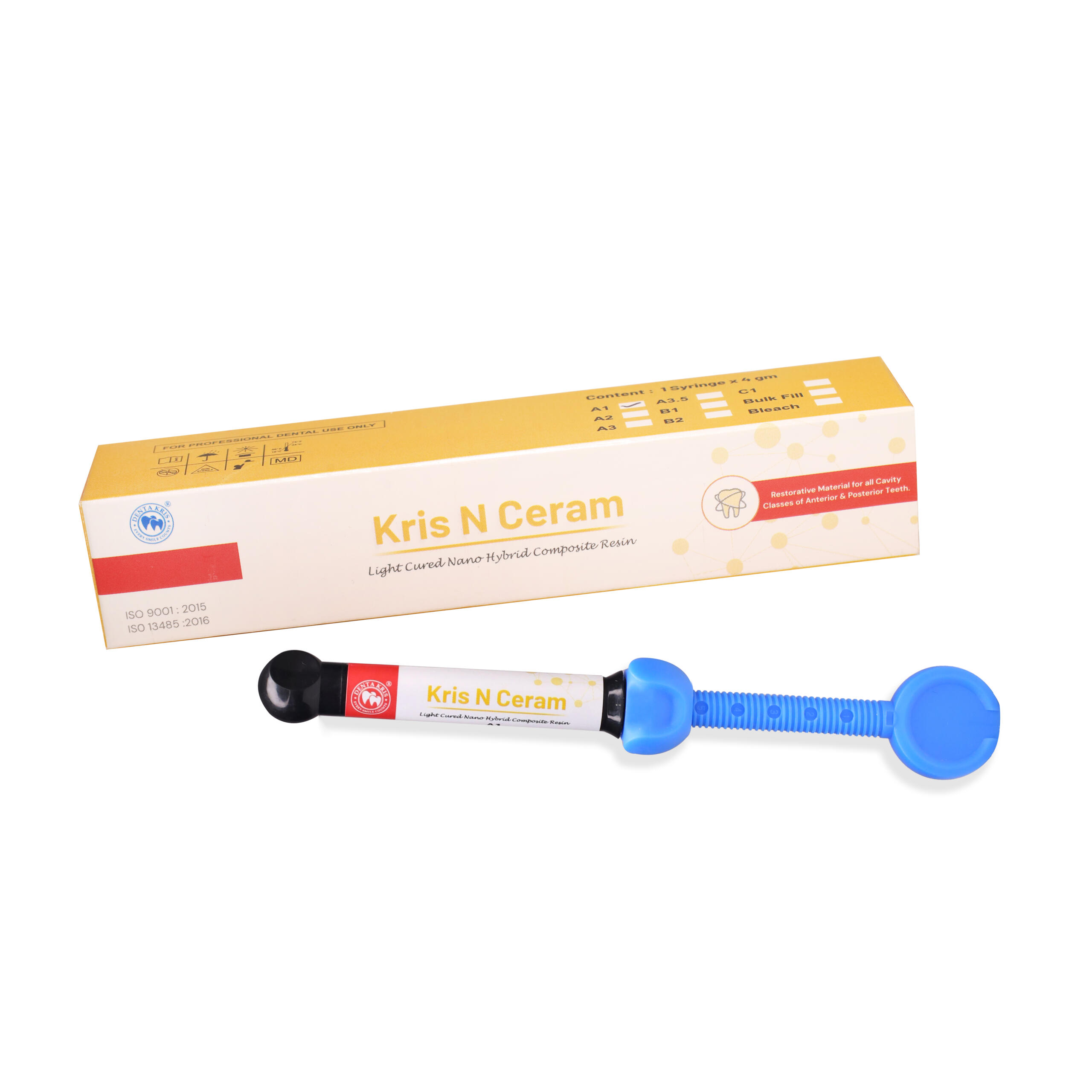 Description: Kris N Ceram+ is a visible light-cured, highly radiopaque filled composite restorative material for anterior and posterior restorations of all teeth. Kris N Ceram+ is indicated for direct filling of class I, II, III, IV and V Cavities in anterior and posterior teeth. Preventive resin restoration and repair of composite / ceramic veneers.