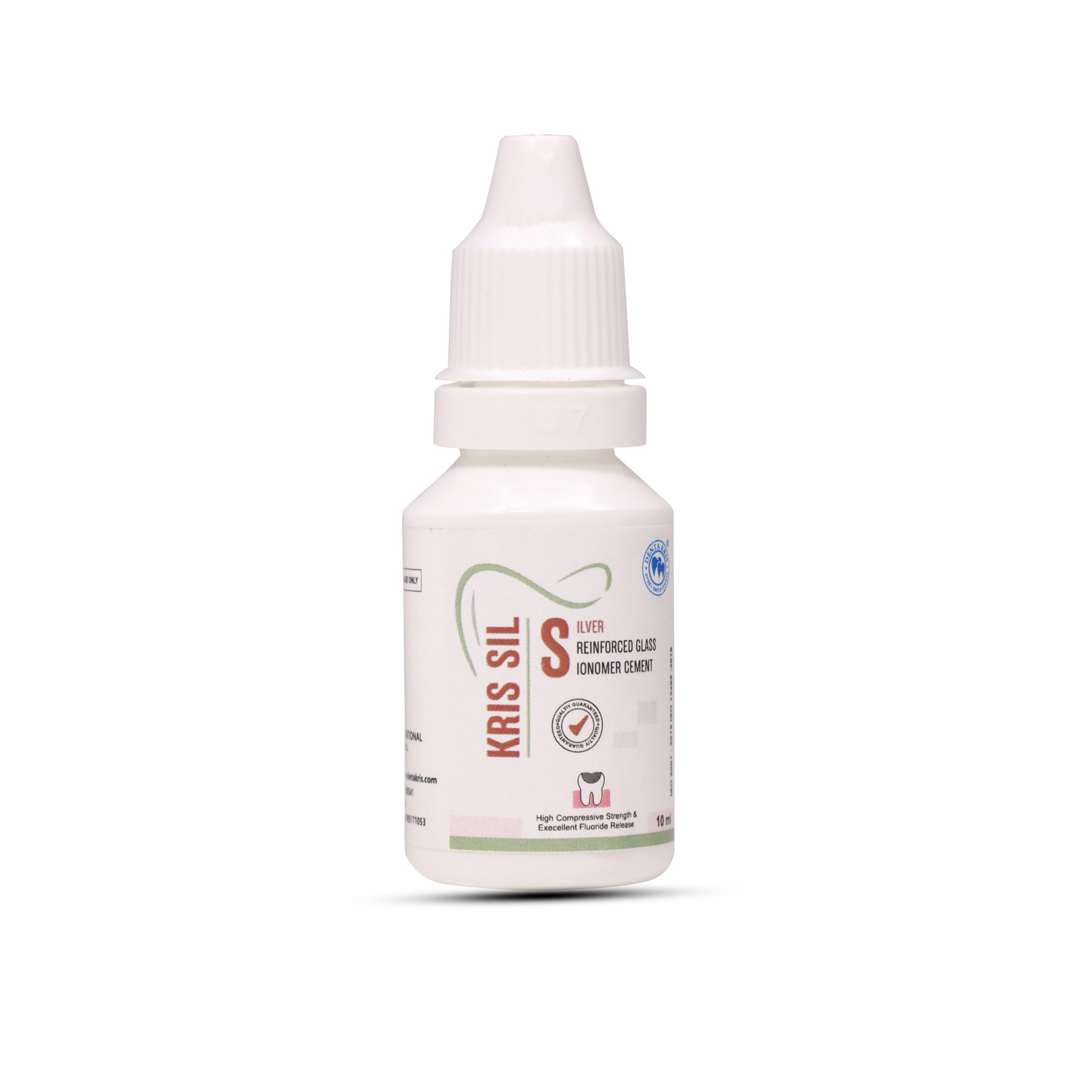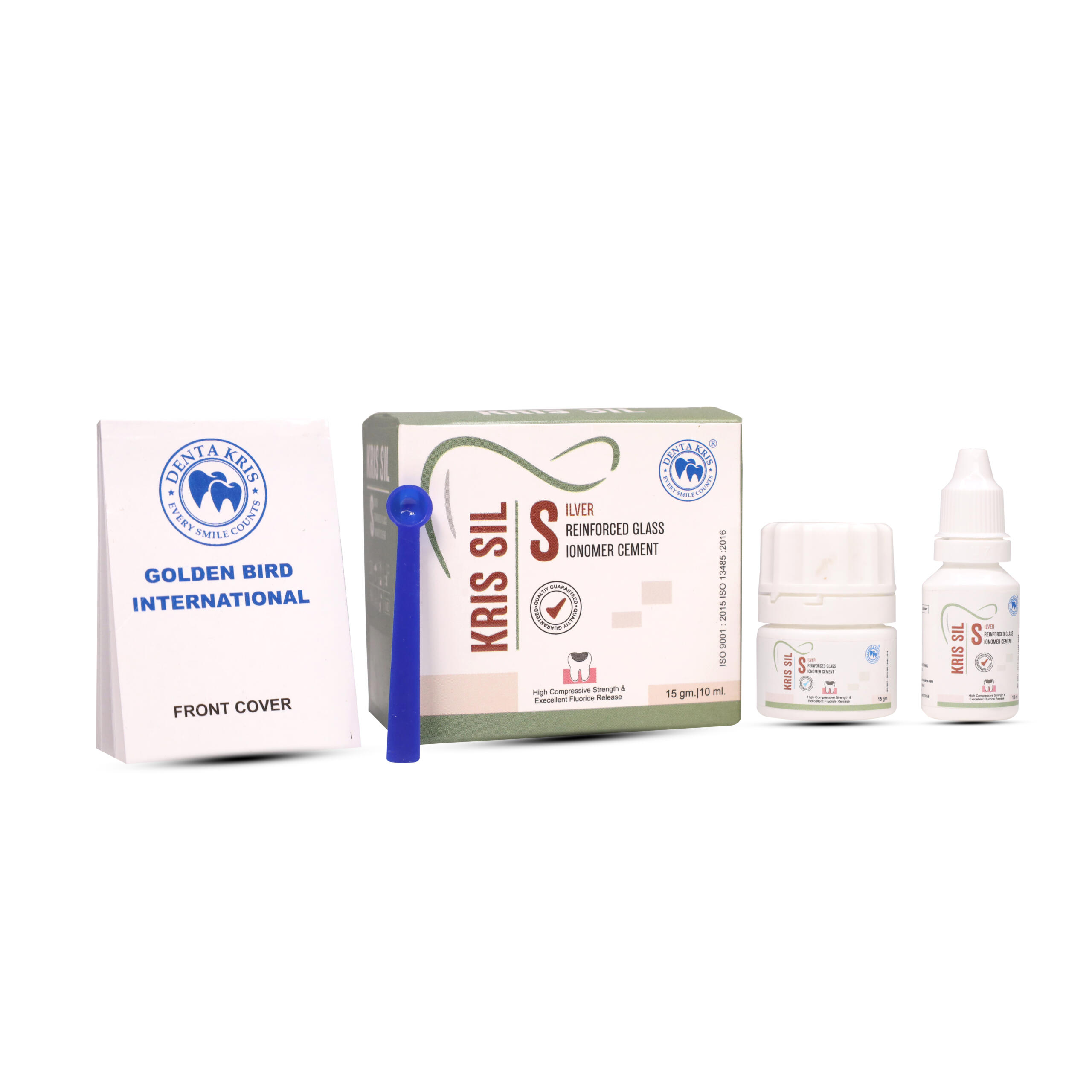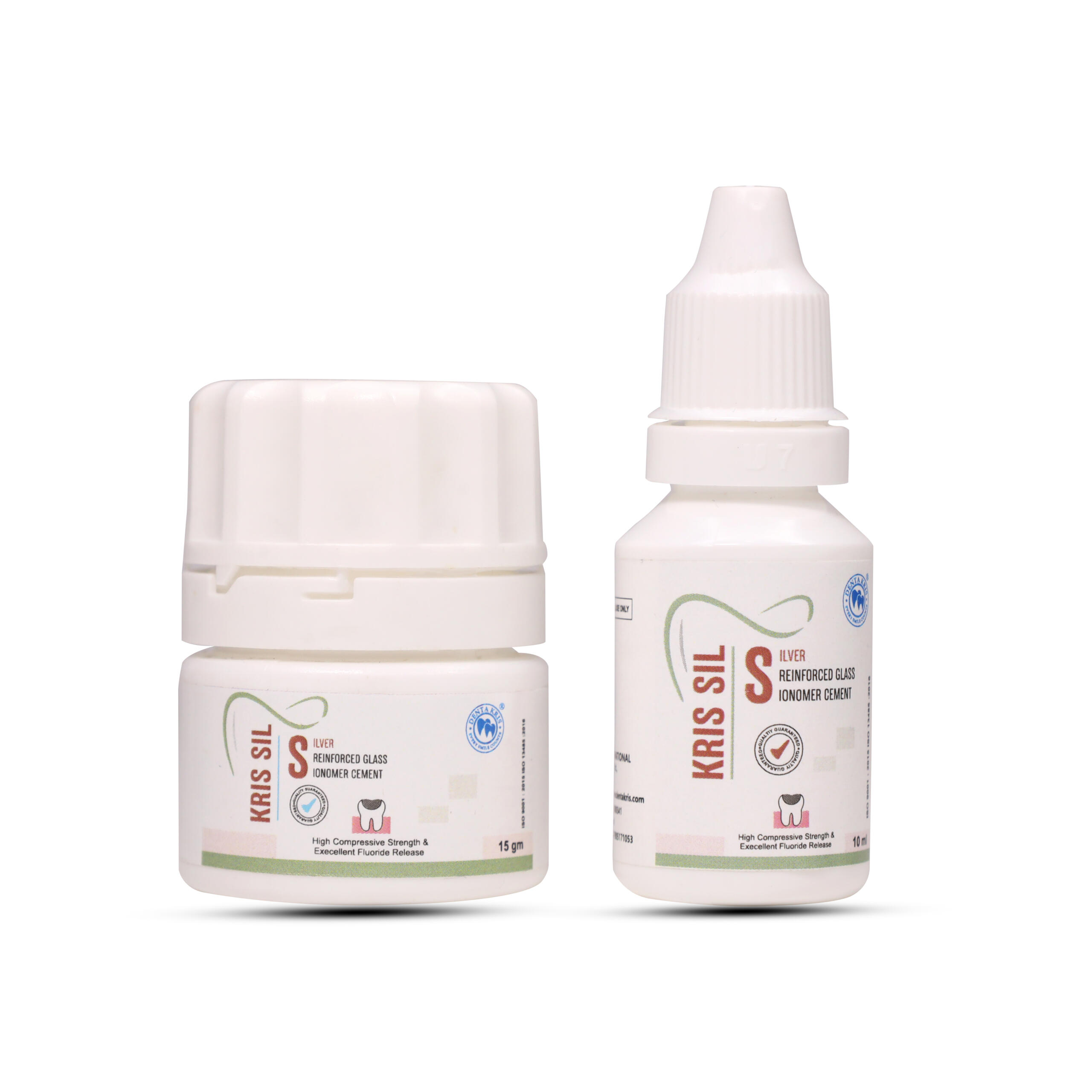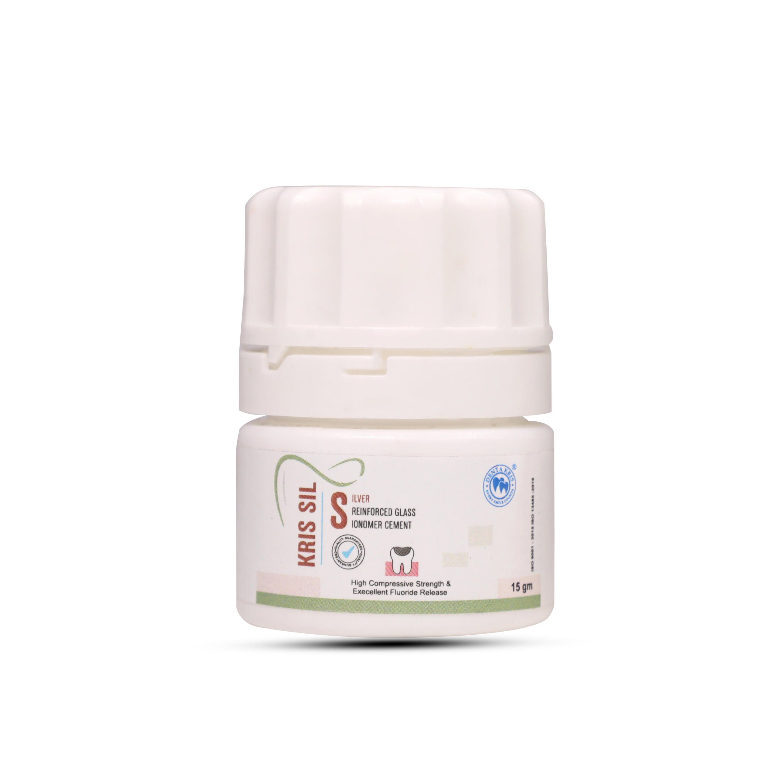 Description: Kris -Sil contains silver-tin alloy with glass Ionomer which provides an ultimate balance between working and setting time. Provides restoration of class-III, IV & limited class-I cavities, base under posterior composite restorations and amalgams, core build-ups, crowns and amalgams repairs, primary teeth fillings, fast-setting, radiopaque, non-translucent silver reinforced, excellent thermal expansion, high strength and hardness.