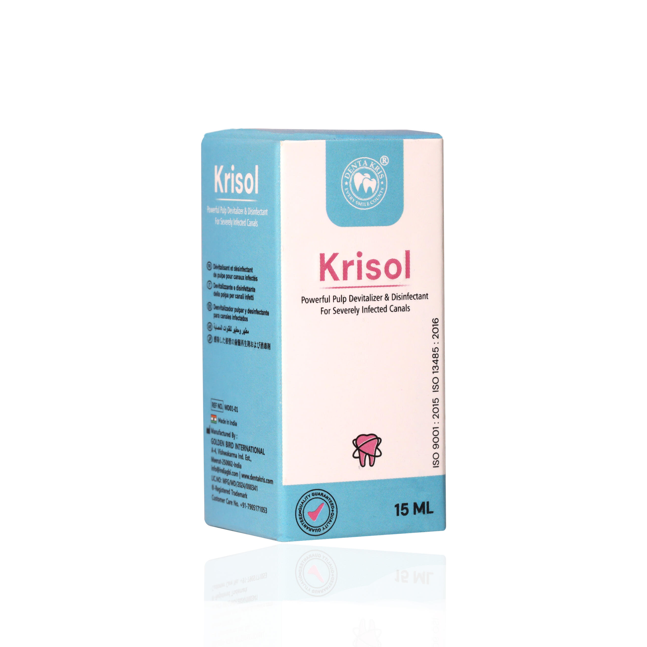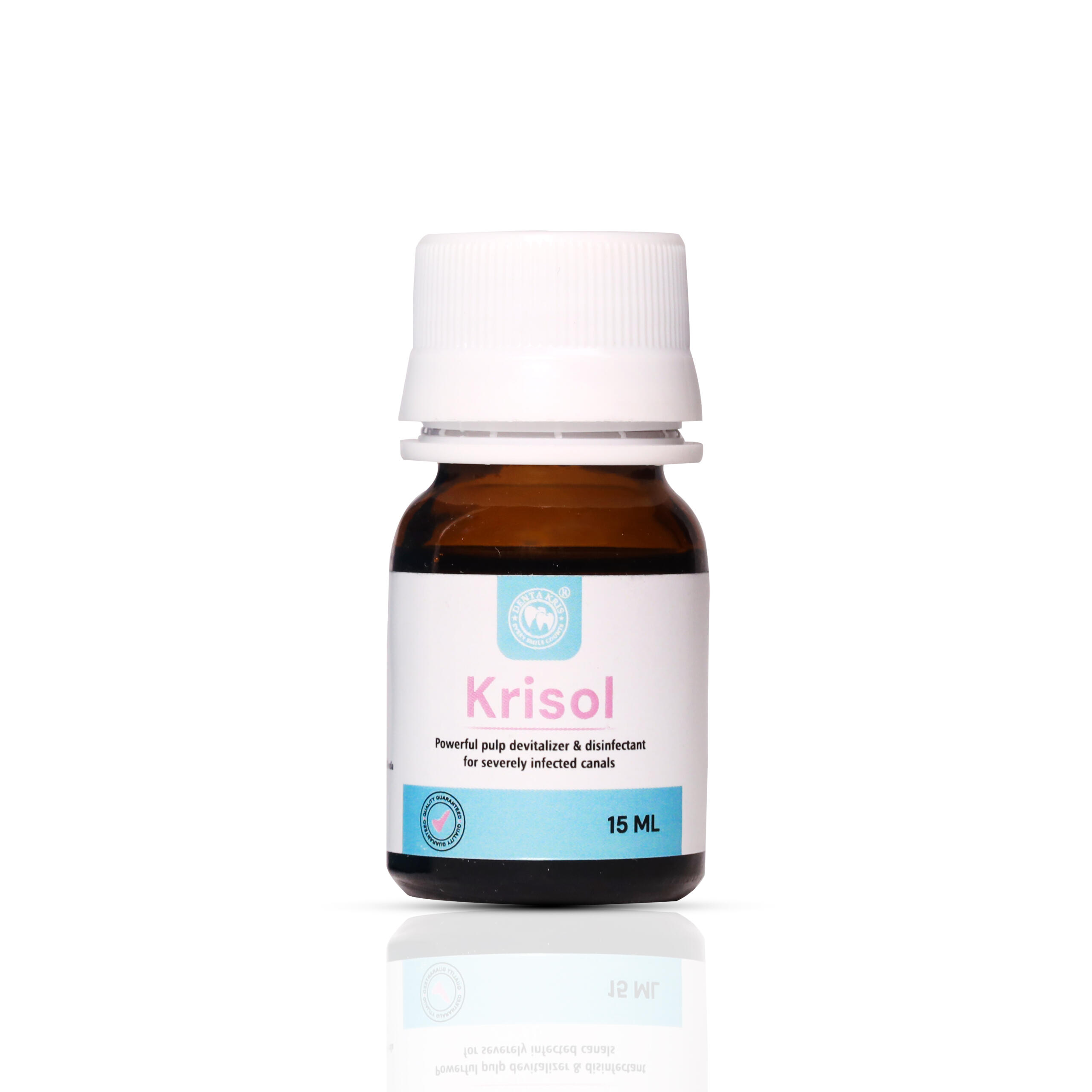 Description: Krisol is a disinfectant and devitalizing solution used for root canal disinfection, highly efficient in vital pulpotomy due to its antibacterial activity. Being milder than arsenic paste, it’s often used in pediatric dentistry.